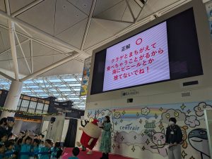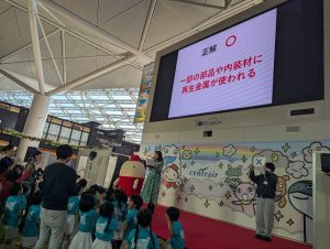 園外活動 セントレアLOVE the Earth プロジェクト~地球にやさしいアップサイクル~2025年11月23日 第1ターミナル4階 イベントプラザにて SDGs実践報告をしました 地球にはゴミがいっぱい! みんなで『おそうじパーティ』をしてゴミ拾いをしています ♪ 海の豊かさを守ろう 遊戯 ♪ カーニバる? みんなで ♪ カーニバる? \(^o^)/ 地球に優しいSDGsクイズ大会 前の記事を見る< 一覧に戻る 〈 前の記事を見る 一覧に戻る